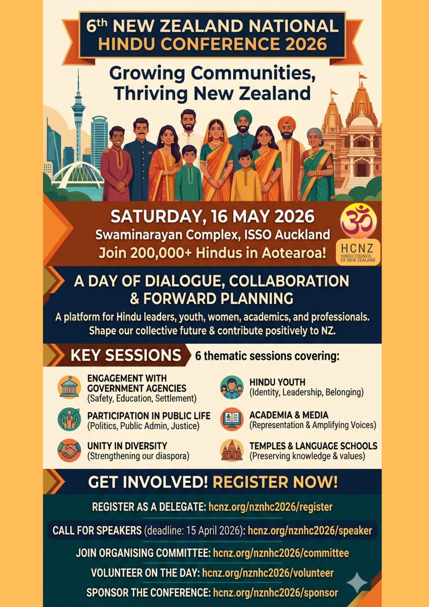 The Hindu Council of New Zealand (HCNZ) has officially announced the sixth New Zealand National Hindu Conference, set to take place on Saturday, 16 May 2026, at the Swaminarayan Complex, ISSO, in Auckland.
